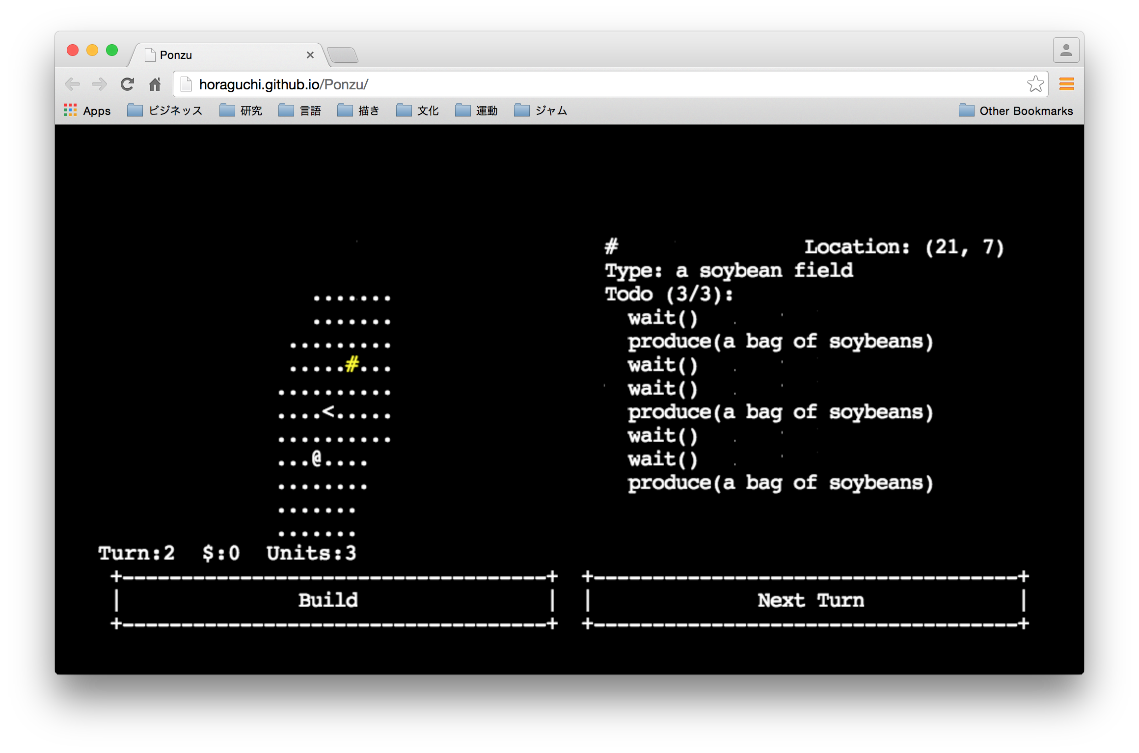 What I'll call automatic actors consist of a location on the map, a type identifier, and a sequence of instructions that they carry out, one instruction per turn. Initially, the map consists of two automatic actors, a soybean field (#) and a base (<). Soybean fields produce a bag of soybeans every three turns. The base doesn't start with any actions. Clicking on the instructions will display the actor's inventory.
